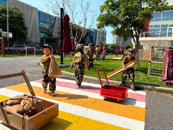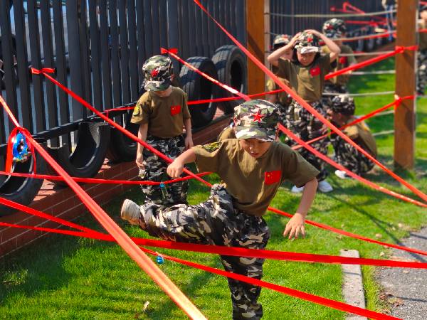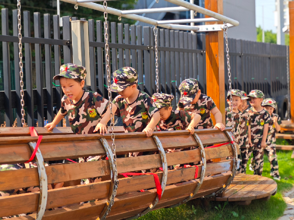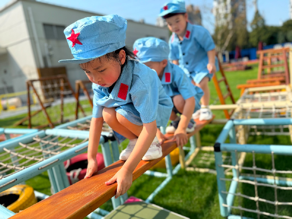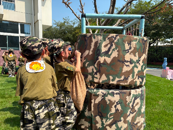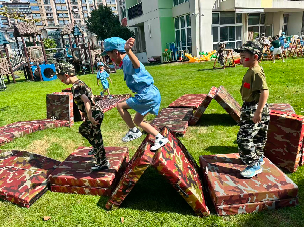 穿上迷彩服,戴上小军帽,在自己精心设计的“长征路线”上匍匐前进,上前线“送军粮”、翻越“雪山”、穿越“火线”……每一个关卡都充满挑战与趣味,孩子们在户外阳光下体验“长征”,不怕辛苦不怕累,俨然一副“小小兵”的模样。