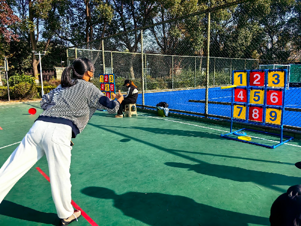 飞盘掷准赛场,教师们神情专注、站姿稳健,紧盯九宫格目标精准投掷。每一次发力都沉稳细致,全力以赴向着高分奋进,尽显昂扬斗志。