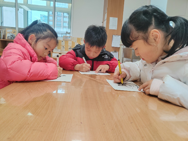 孩子们用毛笔、记号笔、印章在红色卡纸上“画”“马”、“福”,有的孩子照着模板描摹,有的孩子创意十足地自己设计,长卷画上留下了孩子们对马年满满的祝福——“马上有福”咯!