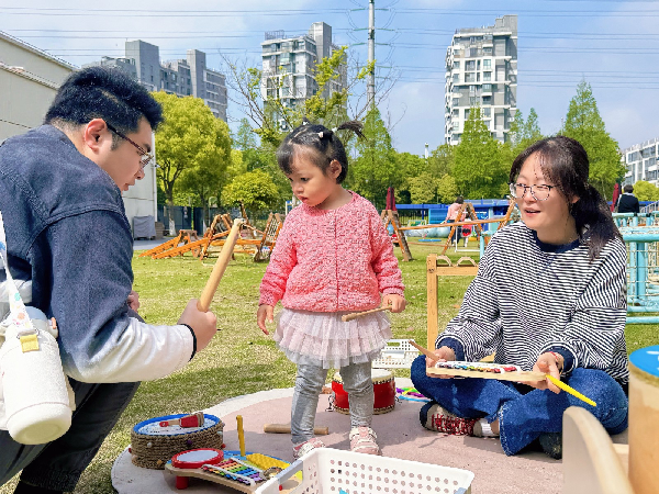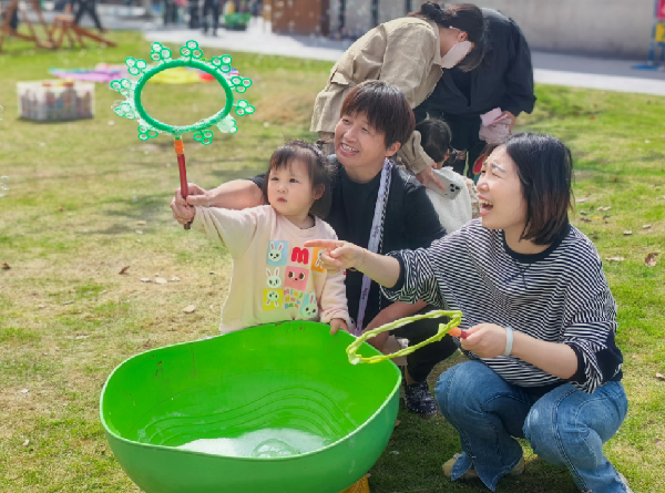 本次开放日以 “游戏互动” 为核心,精心设计了十余项趣味体验活动,覆盖感官探索、创意表达、体能锻炼、亲子协作等多个维度。“小小演奏家” 区域内,孩子们通过弹奏小钢琴、敲击小鼓、摇晃装着黄豆的瓶子,聆听不同材质碰撞出的多样声响,在玩乐中感知音律;“动物花花衣”“春日花瓶” 等创意工坊里,宝贝们与家长默契配合,用涂画、揉泥、撕纸、缠绕等方式,将自然素材与艺术想象结合,完成专属的亲子创作;“噼里啪啦”“小刺猬背果果”“顺藤摸瓜” 等体能游戏中,孩子们踮脚、爬行、翻滚,在肢体活动中锻炼协调性,欢声笑语遍布校园;彩虹伞下的集体互动、趣玩水世界的色彩探索、娃娃家的角色扮演、欢乐泡泡的梦幻氛围以及快乐骑行的自由体验,让孩子们在多元场景中释放天性,也让家长直观看到孩子的社交能力与探索欲。